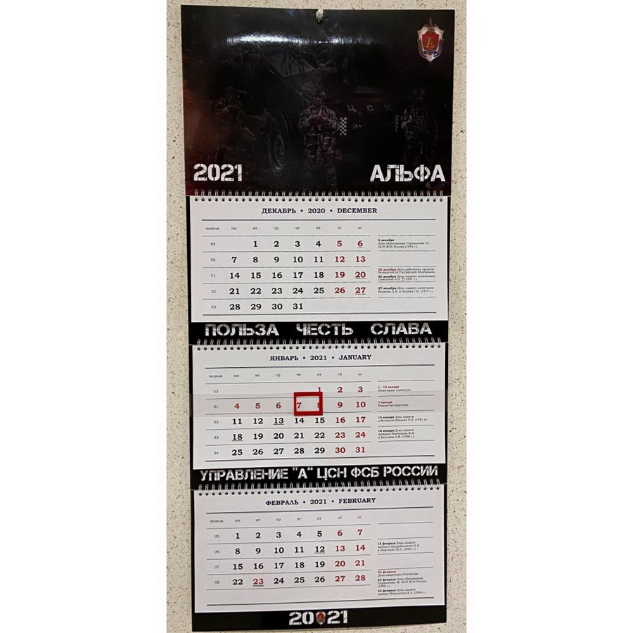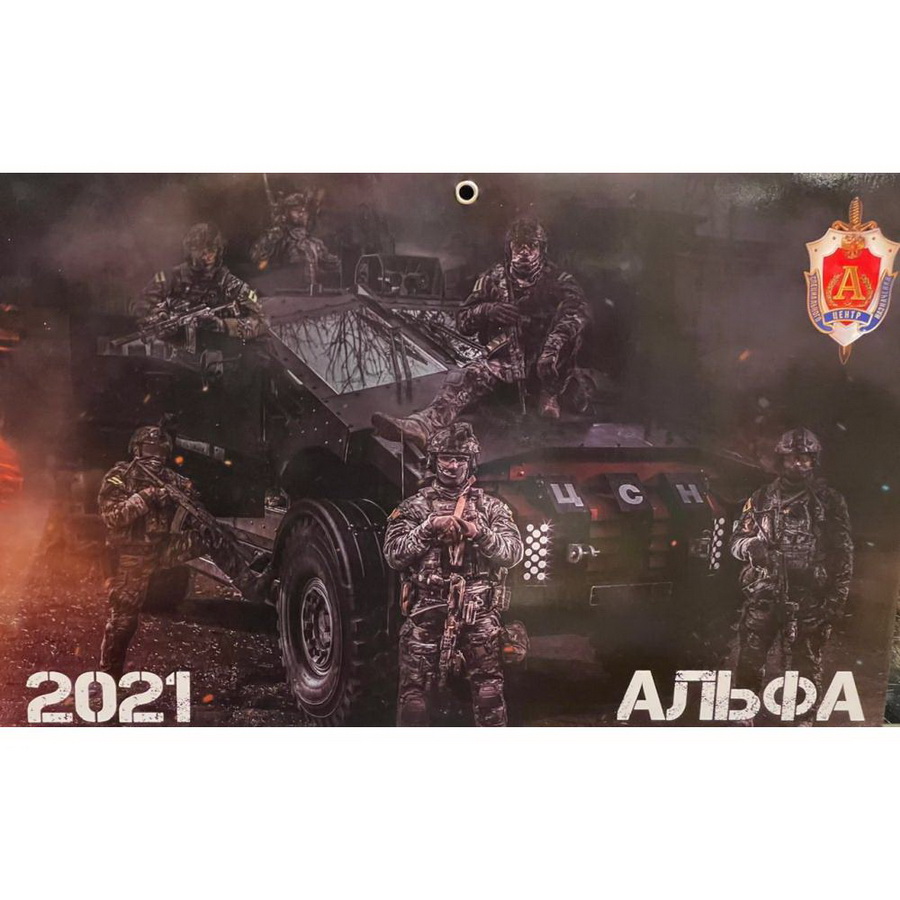 Календарь квартальный трёхблочный настенный «АЛЬФА» ЦСН ФСБ РФ 2021. Указаны памятные даты ЦСН ФСБ РФ 2021 г, а также выходные и праздничные дни. На постере фото группы бойцов АЛЬФА.