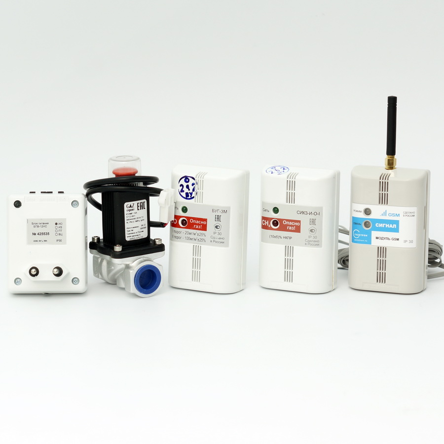 Комплект используется для автоматического измерения в воздухе доли горючих газов (природный газ – метан, СН4) и продуктов сгорания топлива (угарный газ, СО), с перекрытием магистрали подачи газа при превышении измеряемых параметров, и позволяет с помощью СМС информирования сообщать об аварийной ситуации . Встроенный аккумулятор также позволяет устройству информировать об отключении электроэнергии.