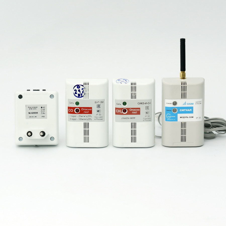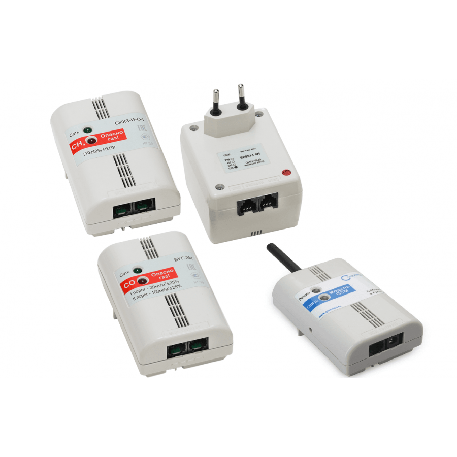 Комплект используется для автоматического измерения в воздухе доли горючих газов (природный газ – метан, СН4) и продуктов сгорания топлива (угарный газ, СО), и позволяет с помощью СМС информирования сообщать об аварийной ситуации. Встроенный аккумулятор также позволяет устройству информировать об отключении электроэнергии.