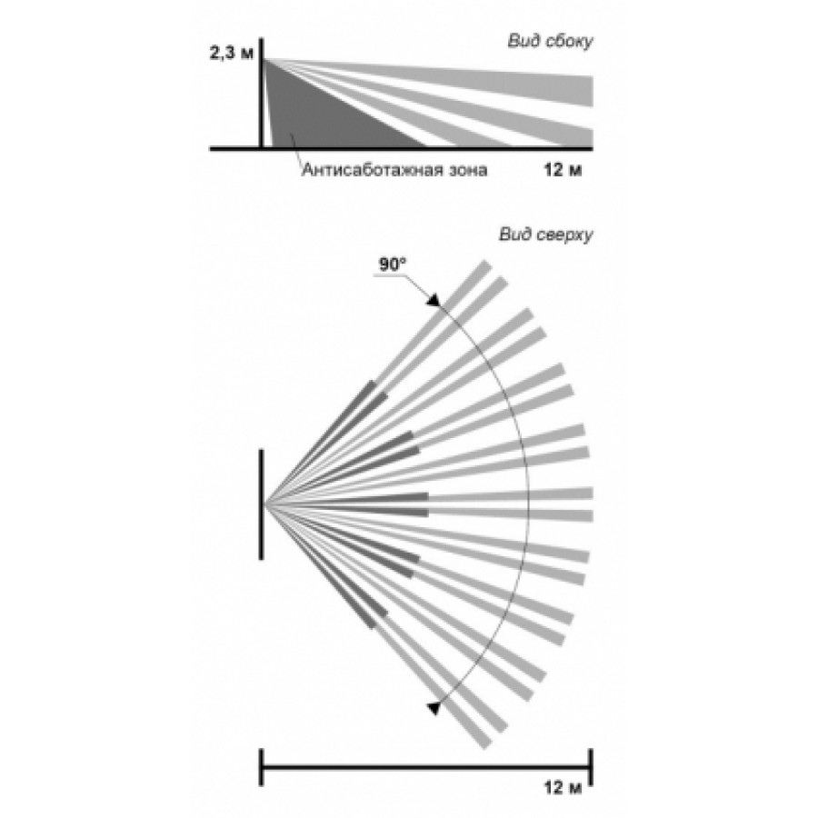 Объемная зона обнаружения и хорошая дальность (12м) обеспечивают надёжный контроль территории. Для предупреждения ложных срабатываний, извещатель оснащен специальным алгоритмом одновременной обработки двух каналов. Формирование оповещений в тревожных ситуациях происходит за счёт размыкания контактов реле.