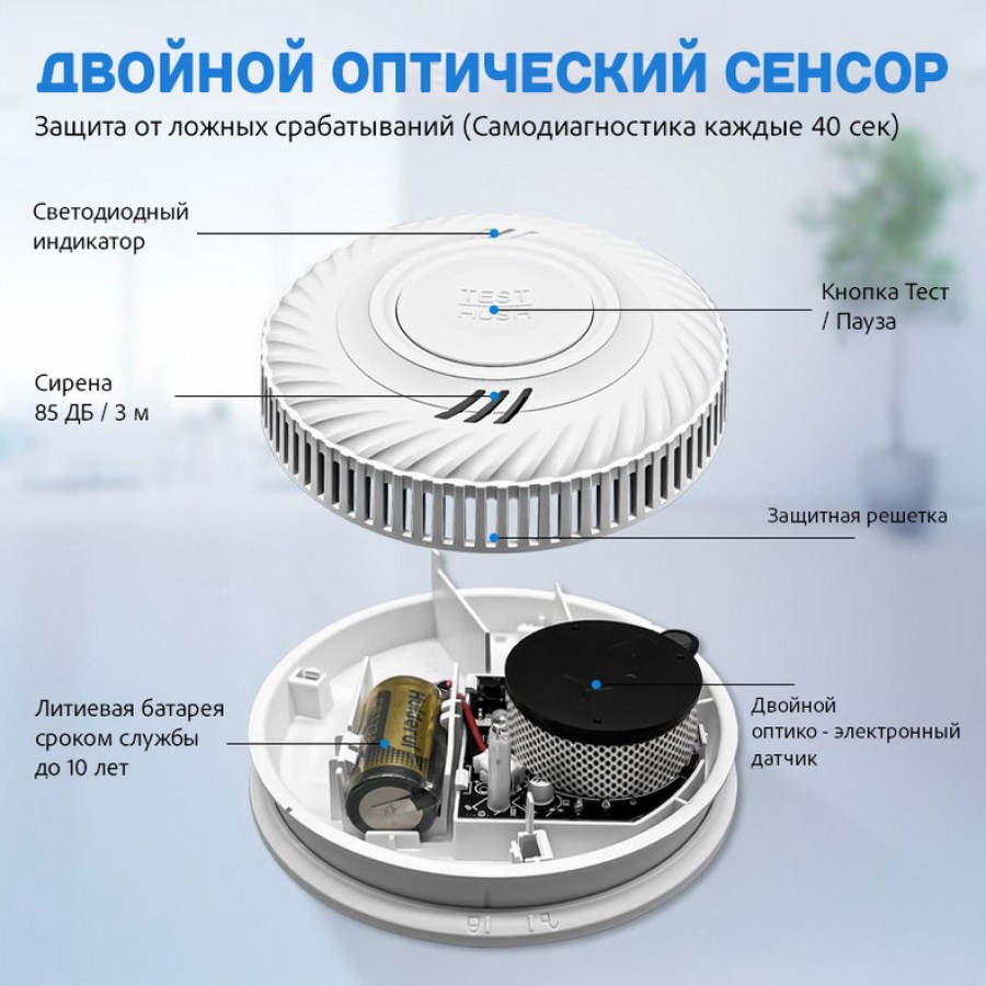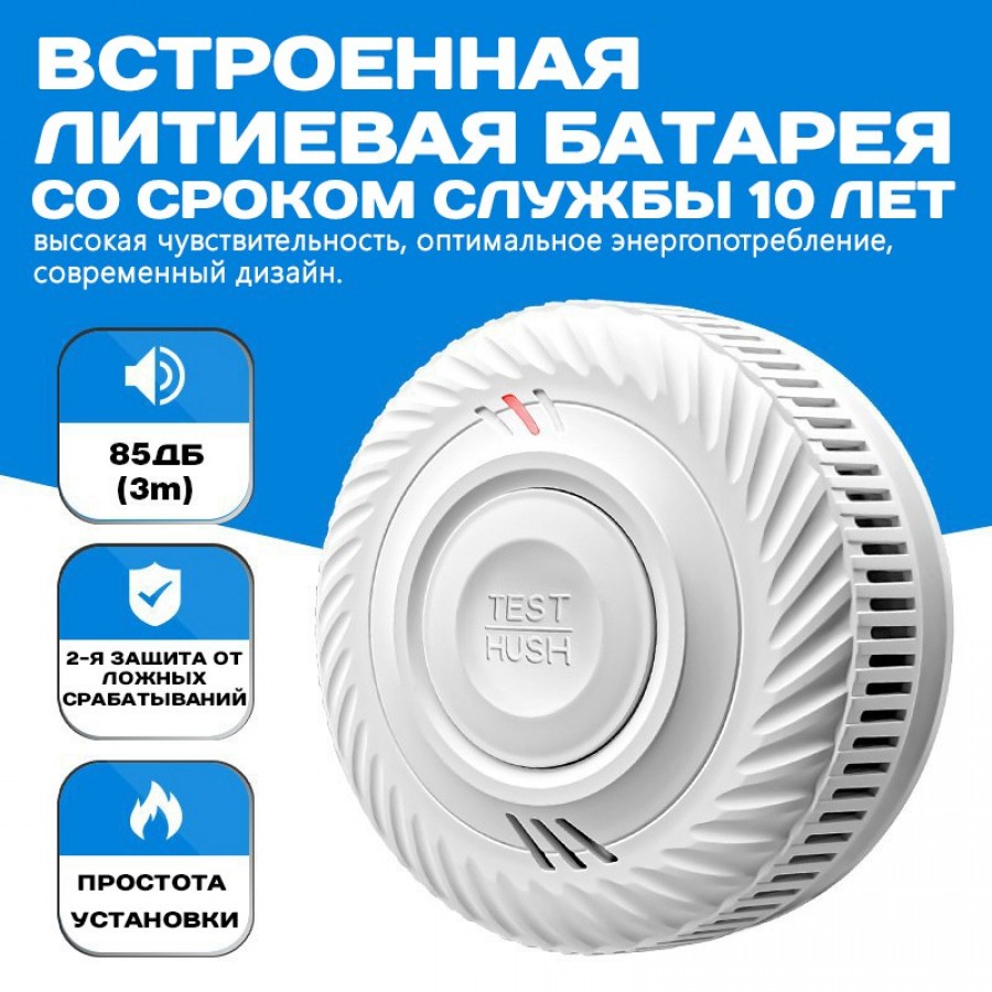 Также датчик оснащен звуковым сигнализатором высокой громкости (более 85 дБ), что позволяет услышать сигнал тревоги даже в зашумленных помещениях - цехах, складах, офисах, торговых точках).