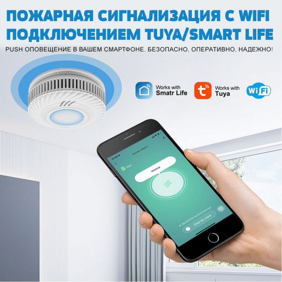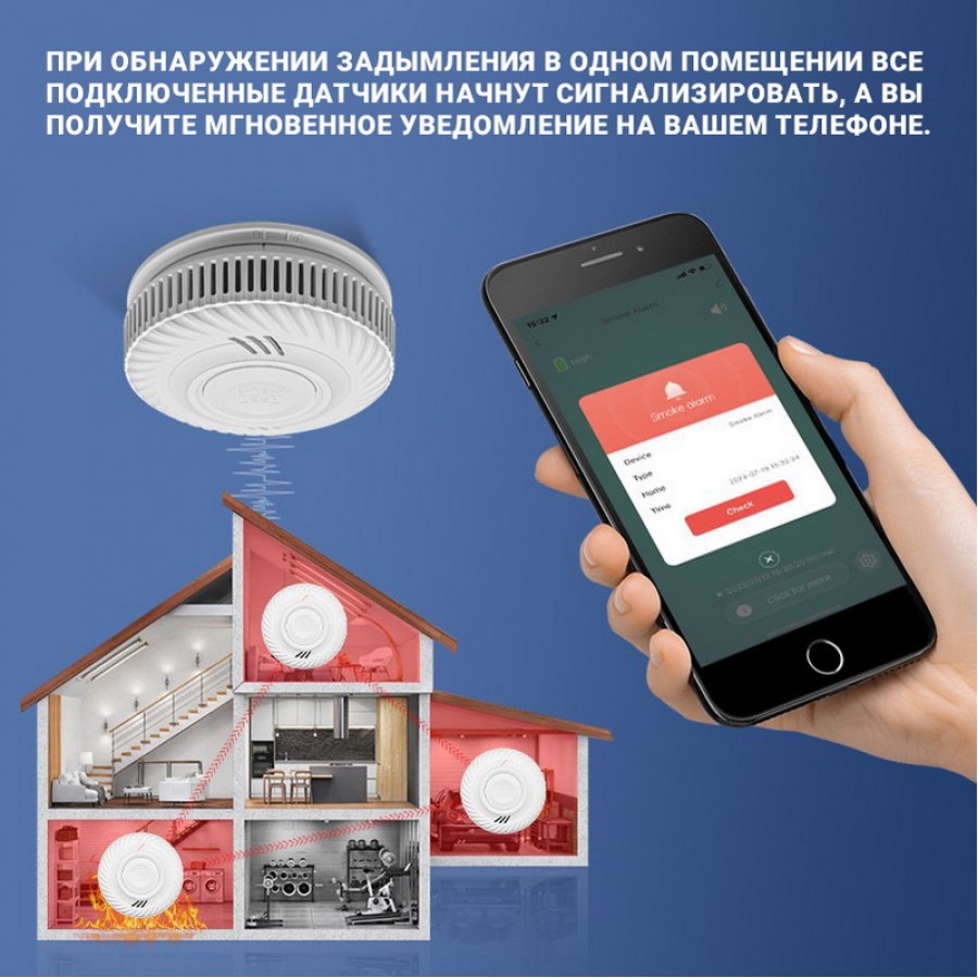 При обнаружении опасной концентрации дыма в воздухе устройство, помимо включения свето-звукового оповещения, незамедлительно отправляет оповещение в мобильное приложение Smart Life/Tuya Smart на смартфон владельца.