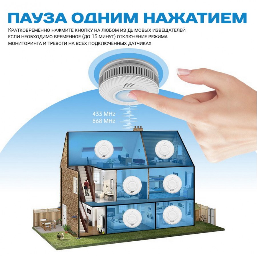 Ведущий (центральный) дымовой WiFi/радиоканальный извещатель ИП-212 Сигнал П-4 предназначен для создания разветвленных беспроводных систем пожарной сигнализации, с возможностью дистанционного контроля через WiFi-сеть, посредством установленного на ваш смартфон приложения Smart Life/Tuya Smart. К данному датчику допускается подключение до 30 ведомых автономных дымовых радиоканальных (433 МГц) извещателей ИП-212 Сигнал П-2, объединенных с ним в единую беспроводную сеть (шлейф). При срабатывании любого из датчиков в цепи сигнал передается на все входящие в сеть датчики, что вызывает их сработку, а так же на ведущий датчик Сигнал П-4, который в свою очередь передает сигнал тревоги на смартфон владельца.