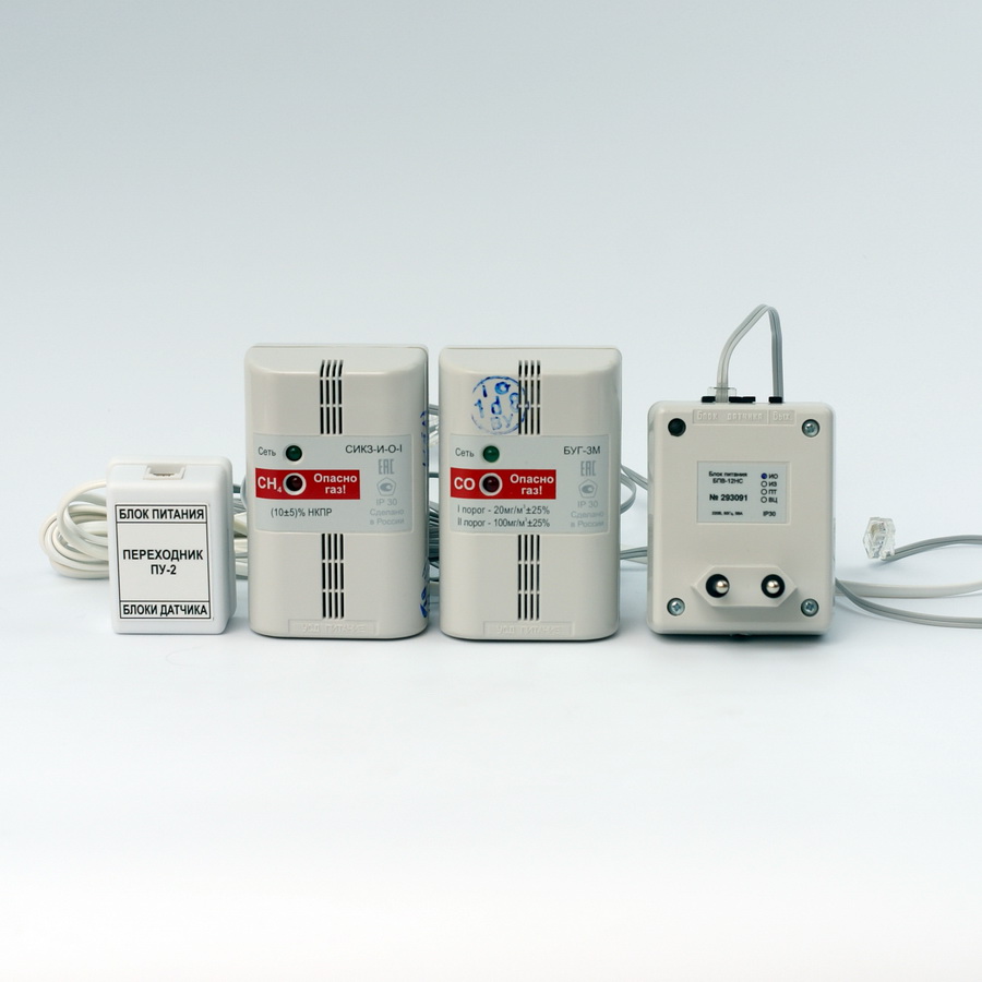Комплект СИК3+БУГ используется для автоматического измерения в воздухе доли горючих газов (природный газ – метан, СН4,) и продуктов сгорания топлива (угарный газ, СО). Данная система выдает звуковой сигнал в случае, если степень загазованности превышает допустимую норму.