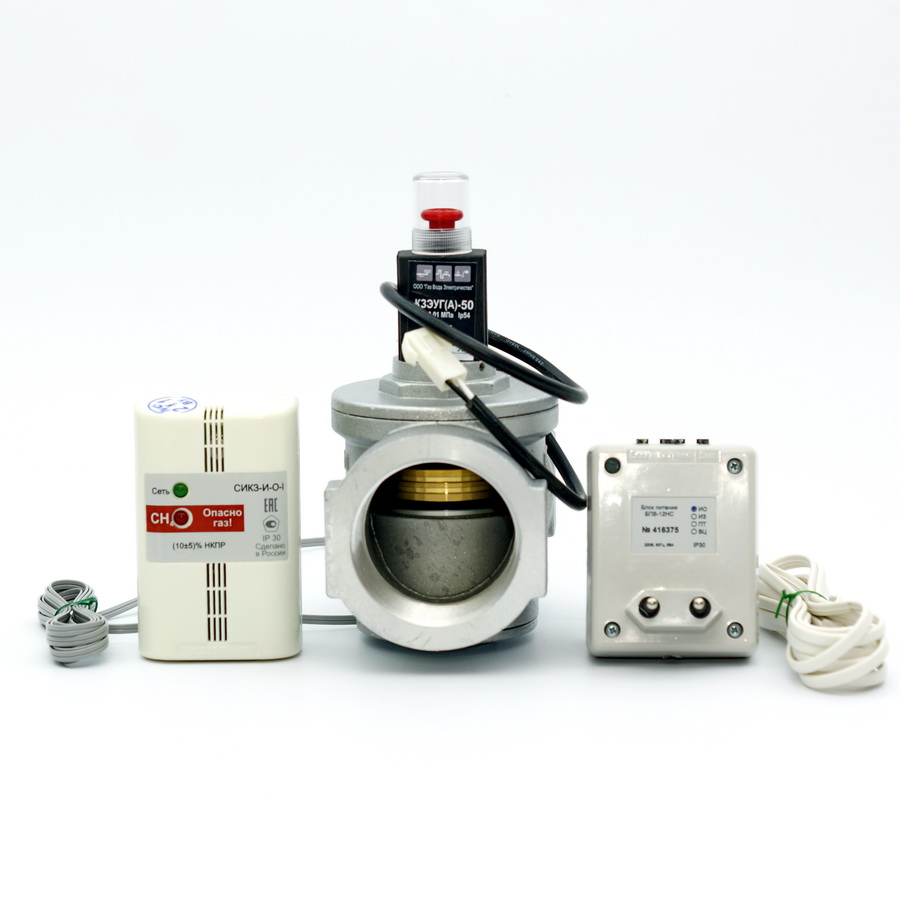 Комплект сигнализатора загазованности СИКЗ-50 с электромагнитным клапаном КЭМГ-А Ду50 (природный газ) автоматически предотвращает серьезные утечки метана и их последствия. При достижении критической концентрации магистрального газа в воздухе клапан перекрывает подачу газа.