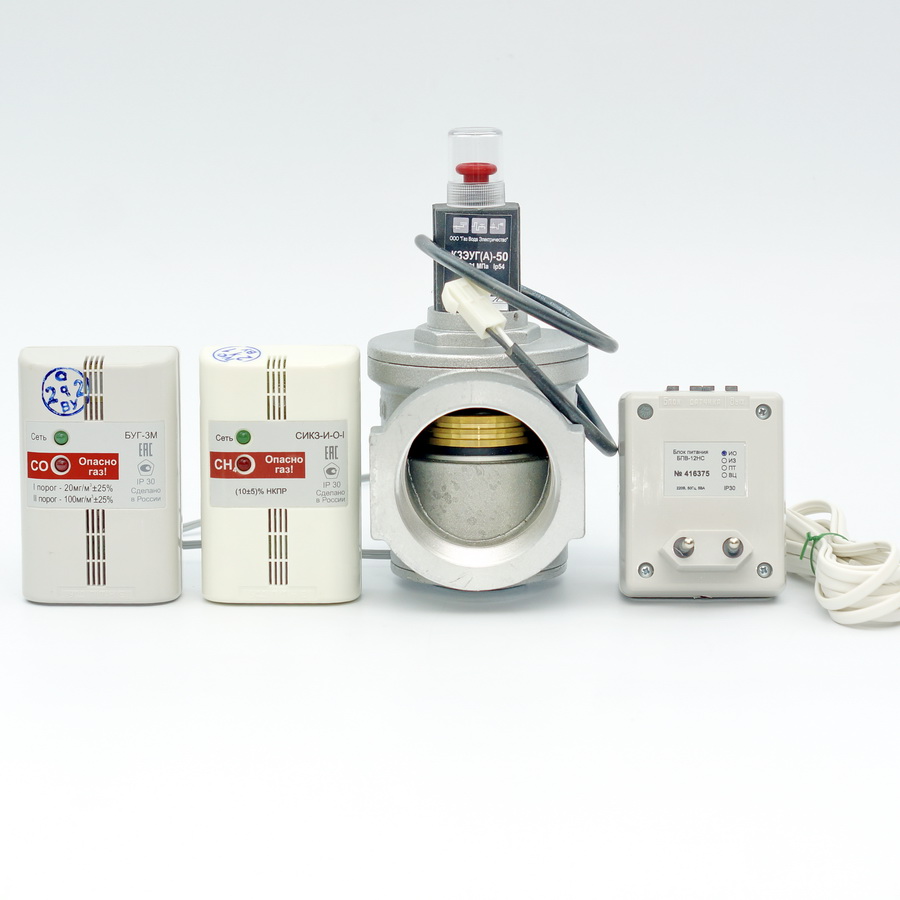 СИКЗ + БУГ-50 Двухгазовый комплект на 2 датчика СН4+СО с клапаном КЭМГ-А Ду-50 – полноценная система, которая обеспечивает газовую безопасность. В составе комплекта датчик природного газа и датчик угарного газа. При превышении допустимого уровня загазованности на сигнализаторе включается звуковое оповещение, а электромагнитный клапан перекрывает подачу газа.