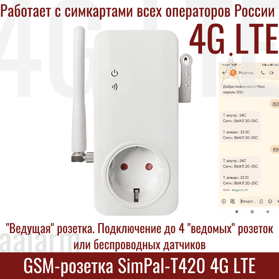 SimPal-T420-V2 розетка с поддержкой 4G LTE — это простое устройство для дистанционного управления питанием. Работает в сети 4G LTE, позволяет дистанционно включать и выключать питание, отправляя SMS или совершая звонки с мобильного телефона. В розетку встроен датчик температуры, который автоматически отправляет SMS при изменении температуры или отключении питания 220 В.