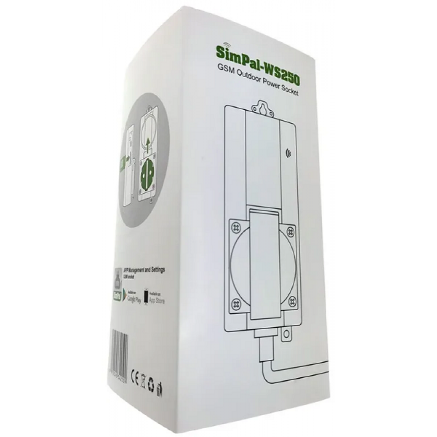 SimPal WS250 - это наружная GSM- розетка с дистанционным управлением и степенью пылевлагозащиты IP44, предназначенная для включения и выключения электрических устройств, и измерения их потребляемой мощности. Питание от сети, контролируемое устройством, может быть подключено с мобильного телефона с помощью SMS, телефонного звонка или мобильного приложения (приложение для Android / iOS).