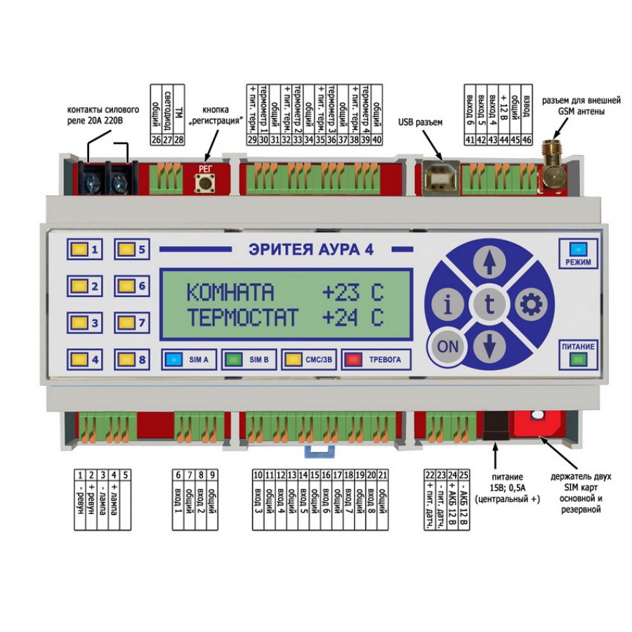 Эритея Аура 4 ─ многофункциональная GSM сигнализация нового поколения. Устройство используется в качестве охранной системы и для осуществления контроля температурного режима в доме. Управление сигнализацией происходит с помощью SMS-команд и через личный WEB- кабинет.