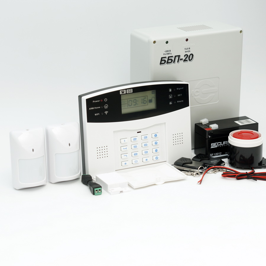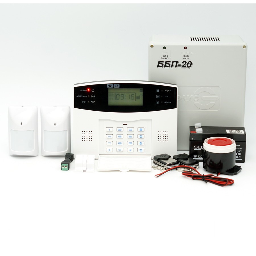 Блок питания 9-12 В. - 1 шт. Проводной датчик движения - 2 шт. Проводной датчик открытия двери/окна - 1 шт.