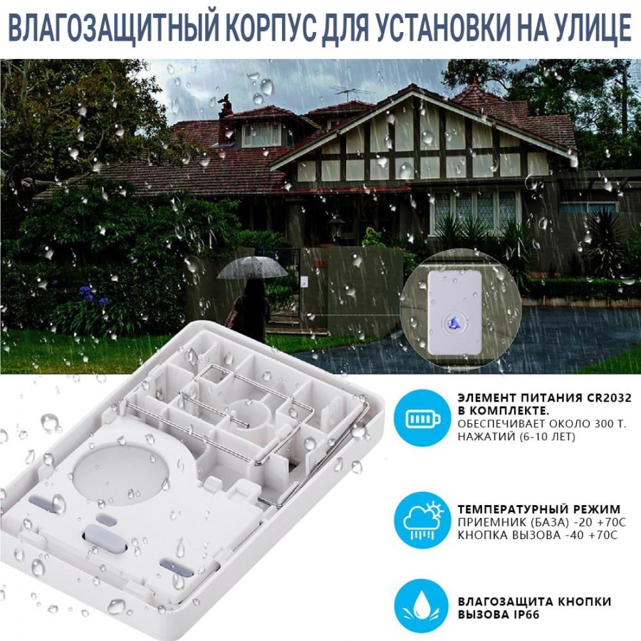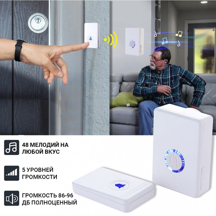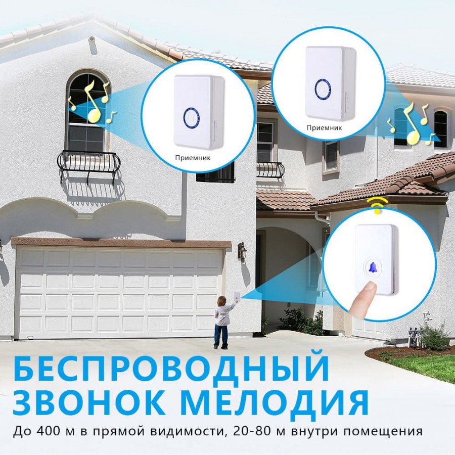 Максимальная дальность передачи сигнала от кнопки вызова до ресивера (звонка) – до 400 метров. В распоряжении пользователя 48 мелодий звонка. Предусмотрено 7 уровней громкости. Корпуса приемника и копок оснащены подсветкой.