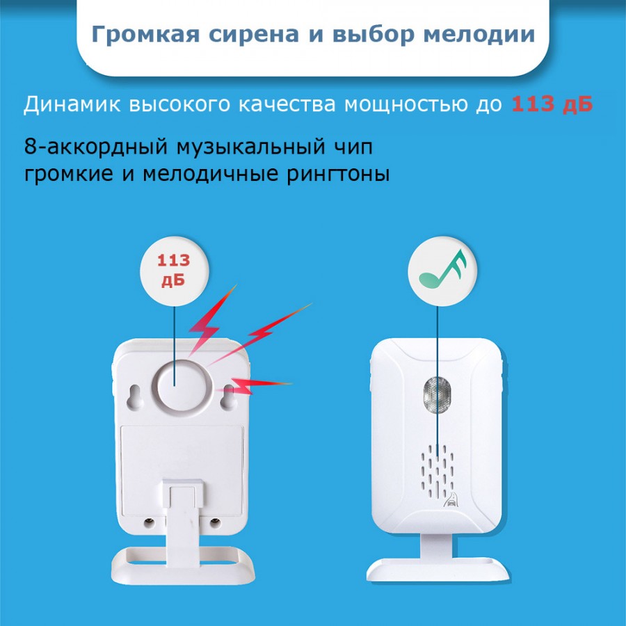 При желании комплект можно дополнить, подключив к нему пульт дистанционного управления или дополнительные извещатели. Владельцу доступно на выбор 32 мелодии, которые оповещают о срабатывании датчика. Также реализовано световое оповещение.