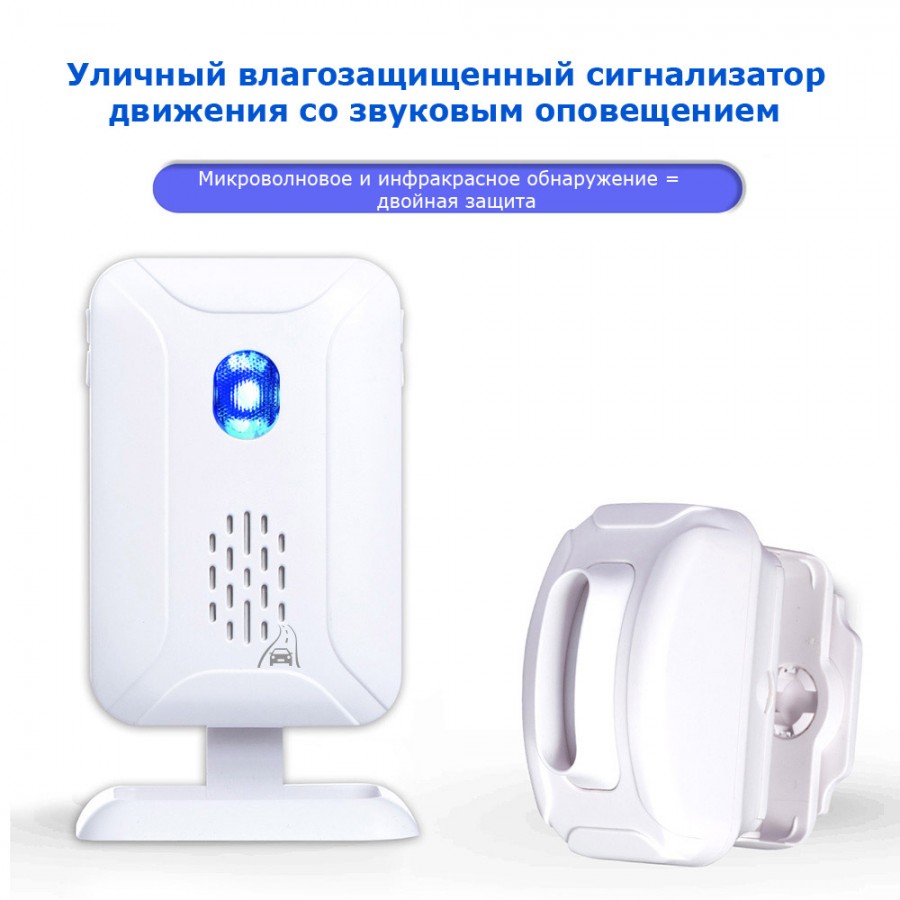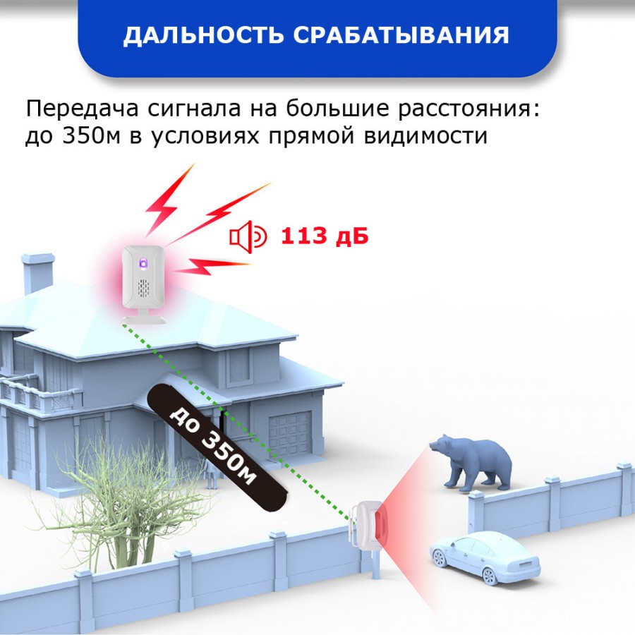 Датчик рассчитан на работу в широком температурном диапазоне, поэтому даже в условиях плохой погоды или мороза он стабильно выполняет свои задачи. Максимальное расстояние между датчиком и приемником – 300 метров. Владельцу доступно на выбор 32 мелодии, которые оповещают о срабатывании датчика. Также реализовано световое оповещение. Система проста в установке и обслуживании.