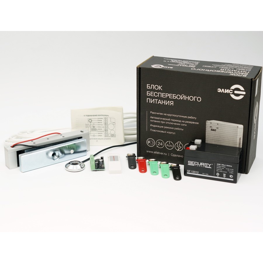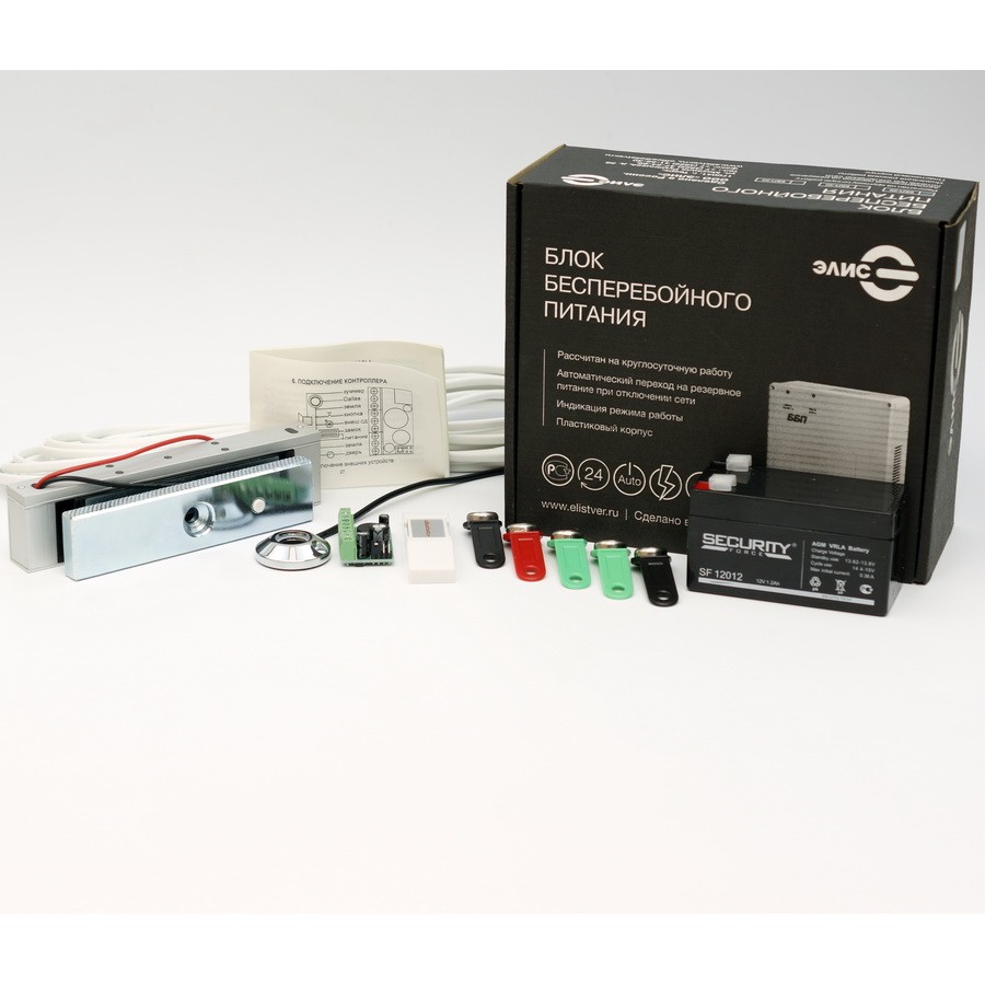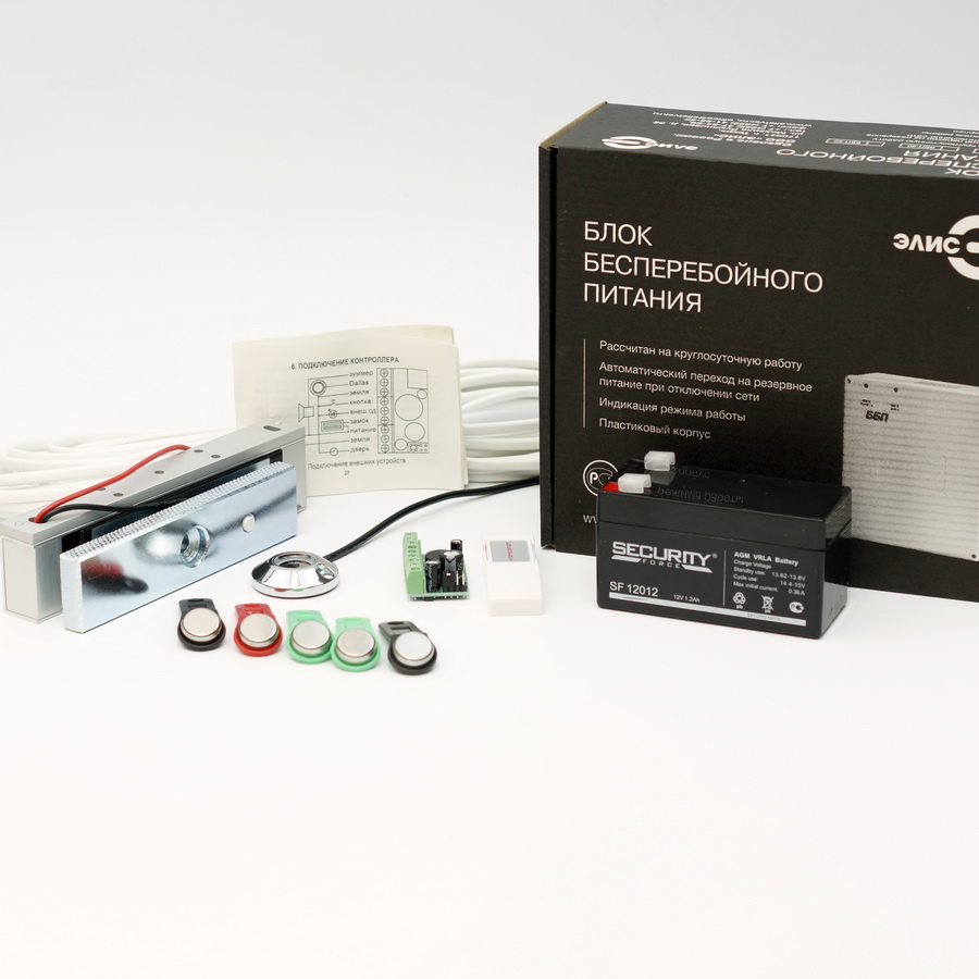Для обеспечения беспрерывной работы системы в комплекте есть источник бесперебойного питания в пластиковом корпусе и аккумулятор. Емкость аккумуляторной батареи – 7 Ач. В ИБП предусмотрена защита от короткого замыкания, перегрузки и перегрева. Благодаря этому, даже при отсутствии питания от электросети вы и ваши сотрудники всегда смогут попасть в офис. И на время отсутствия электроэнергии помещение останется под защитой.