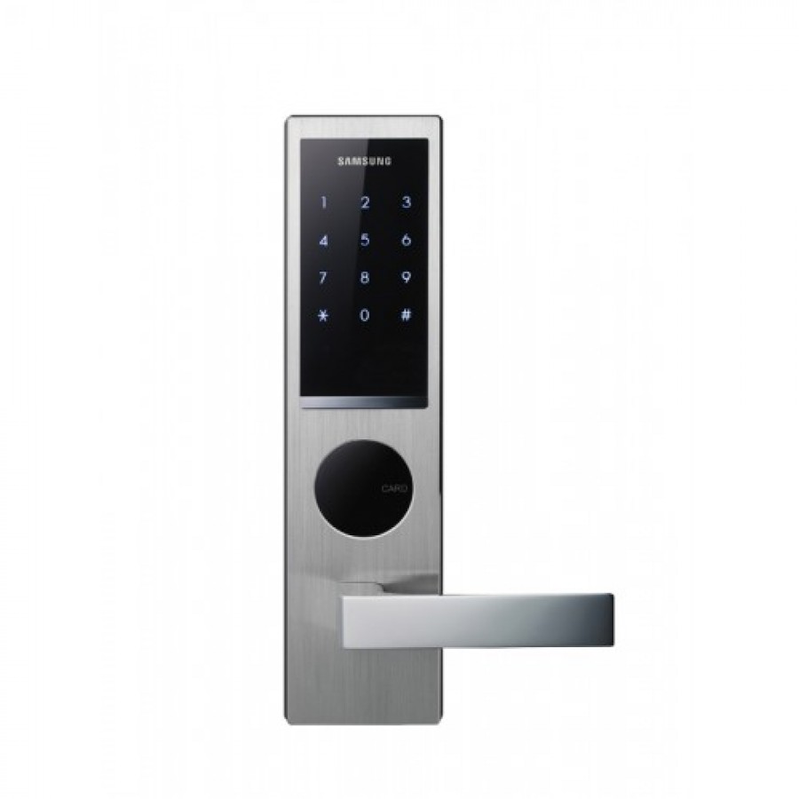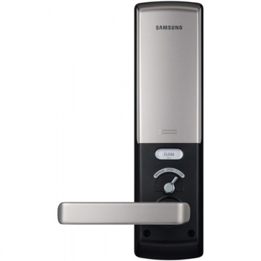 Дверной замок Samsung SHS-H635 FBSEN (6020) – автономное устройство, изготовленное из высокопрочных материалов. Модель сочетает в себе современный стильный дизайн и высокий уровень надежности. Устройство оснащено внешней ручкой, большим сенсорным дисплеем для ввода и двойным стальным ригелем. Особенности модели: