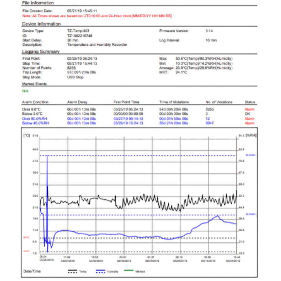 Диапазон тревоги по умолчанию: <2ºC или >8ºC, <40% RH или >80% RH